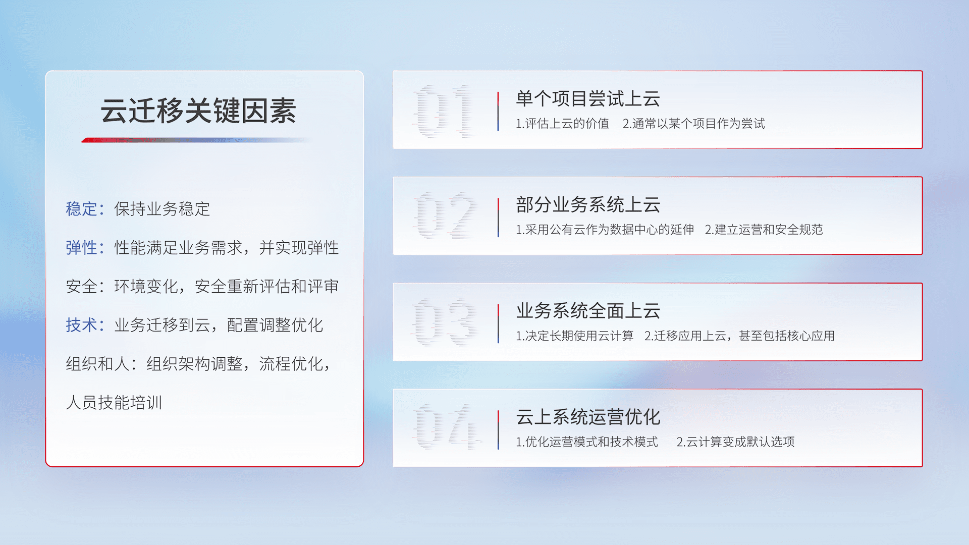 结合实际业务,,,从规划设计、、、云平台选型、、、、云原生改造、、、、数据迁移、、、集成交付,,迁移全过程为客户识别最佳上云路径,,,做好风险识别管理,,设计网络架构、、、身份权限、、、、安全审计合规、、、、操作审计、、、日志审计、、、监控告警策略、、、、多站点容灾设计等,,对云上基础设施进行整体规划,,,,提升IT治理水平,,,,以满足弹性、、高可用、、、、高性能的需求。。。。