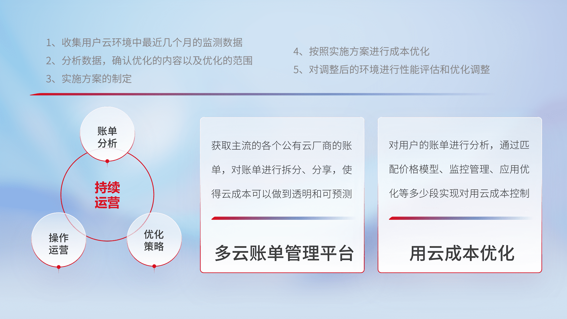 通过多云纳管,,,,以统一的资源数据模型把客户的云资源进行抽象和封装,,,,进而实现对多云资源的统一操作,,,保障云资源管理的可靠性、、、稳定性与可用性。。。量身定制化运维内容,,,,配置、、开发运维、、、补丁管理、、备份、、、、监控、、认证和访问管理、、、审计和日常巡检等,,,保障在用云过程中的可靠度,,,稳定度以及高可用率。。